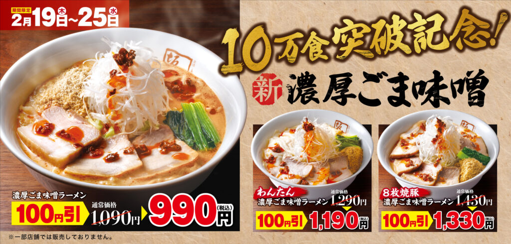 昨年11月から販売開始した季節限定メニュー『濃厚ごま味噌ラーメン』シリーズが10万食を突破したことを記念し、2026年2月19日(木)~25日(水)の7日間で『濃厚ごま味噌ラーメン 100円引きキャンペーン』を開催いたします。フェア期間中は『濃厚ごま味噌ラーメン 』シリーズを100円引きにてご提供いたします。