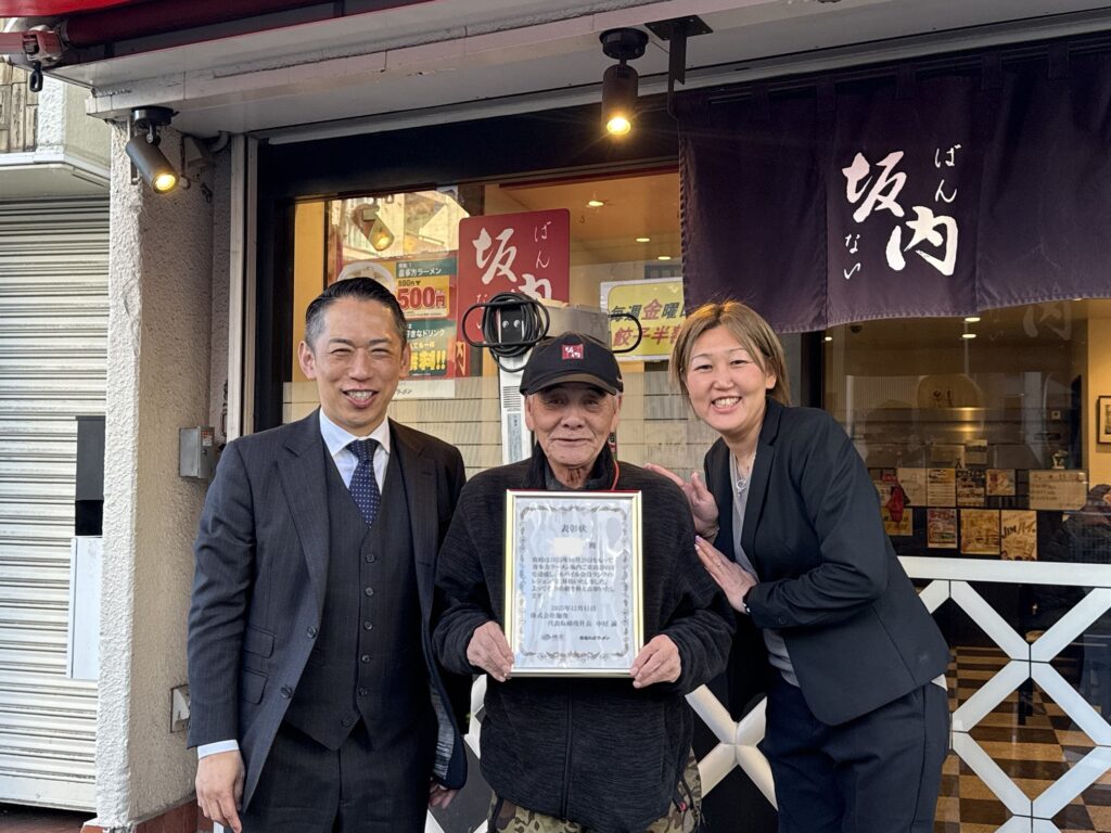 この秋、喜多方ラーメン坂内 調布店のご常連のお客様が3年連続で「レジェンド」にランクアップされました。「レジェンド」はアプリご登録日から1年間で250回ご来店された方に付与される称号で、こちらのお客様はほぼ毎日、時には1日に2回のペースで来店されるなど、喜多方ラーメン坂内を日常の一部としてご利用下さっております。驚くべきことに3年連続で達成されたのは齢82歳(取材当時)のお客様であり、2023年は11月、2024年は10月中旬、2025年も10月中旬に再び「レジェンド」に到達しました。「レジェンド」の誕生は現時点では2人のみ。ランクアップ特典である“社長によるラーメン接待”にご招待し、坂内に対する情熱的な思いや貴重なご意見をお伺いすることができました。